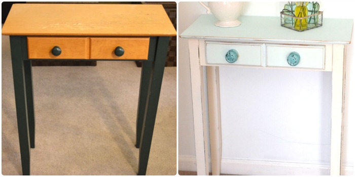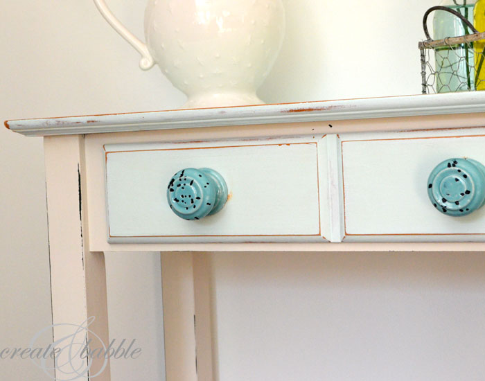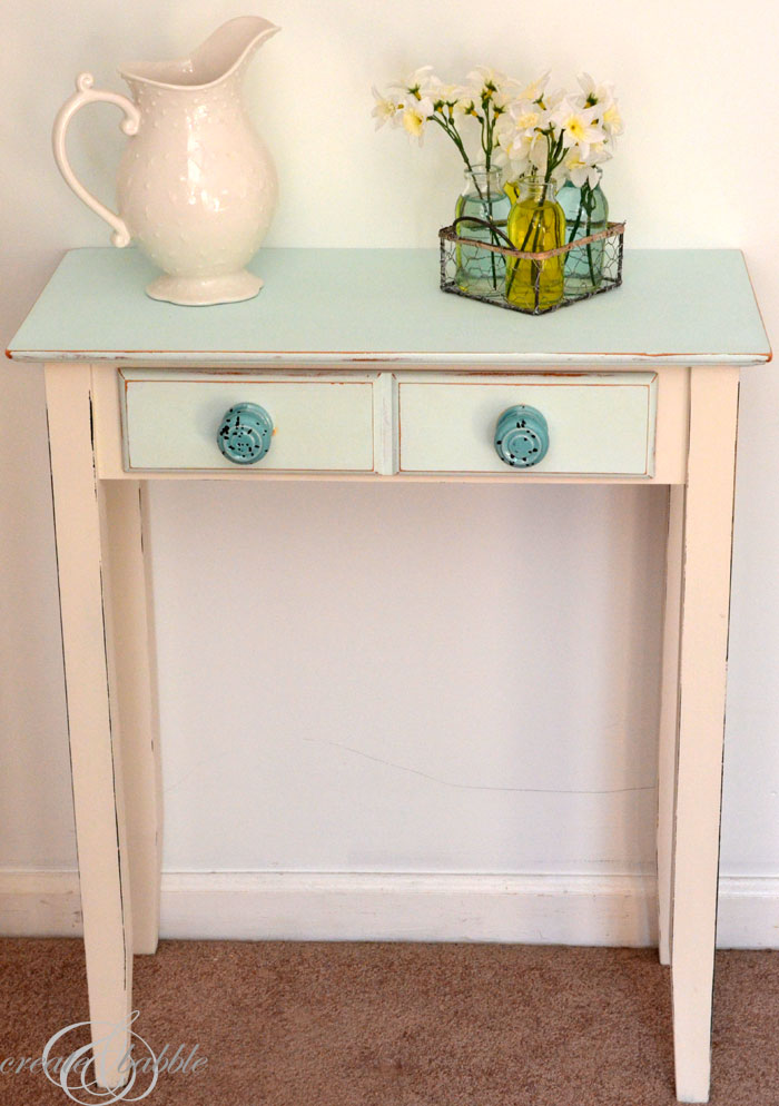 Using some leftover latex paint, I mixed a small amount of homemade chalk paint. Why chalk paint? Because no sanding is required. I just cleaned the table with a water and vinegar solution to give it a good cleaning. Then I painted the top and drawer front in Benjamin Moore’s Barely Teal. I used an off-white paint for the base and legs.