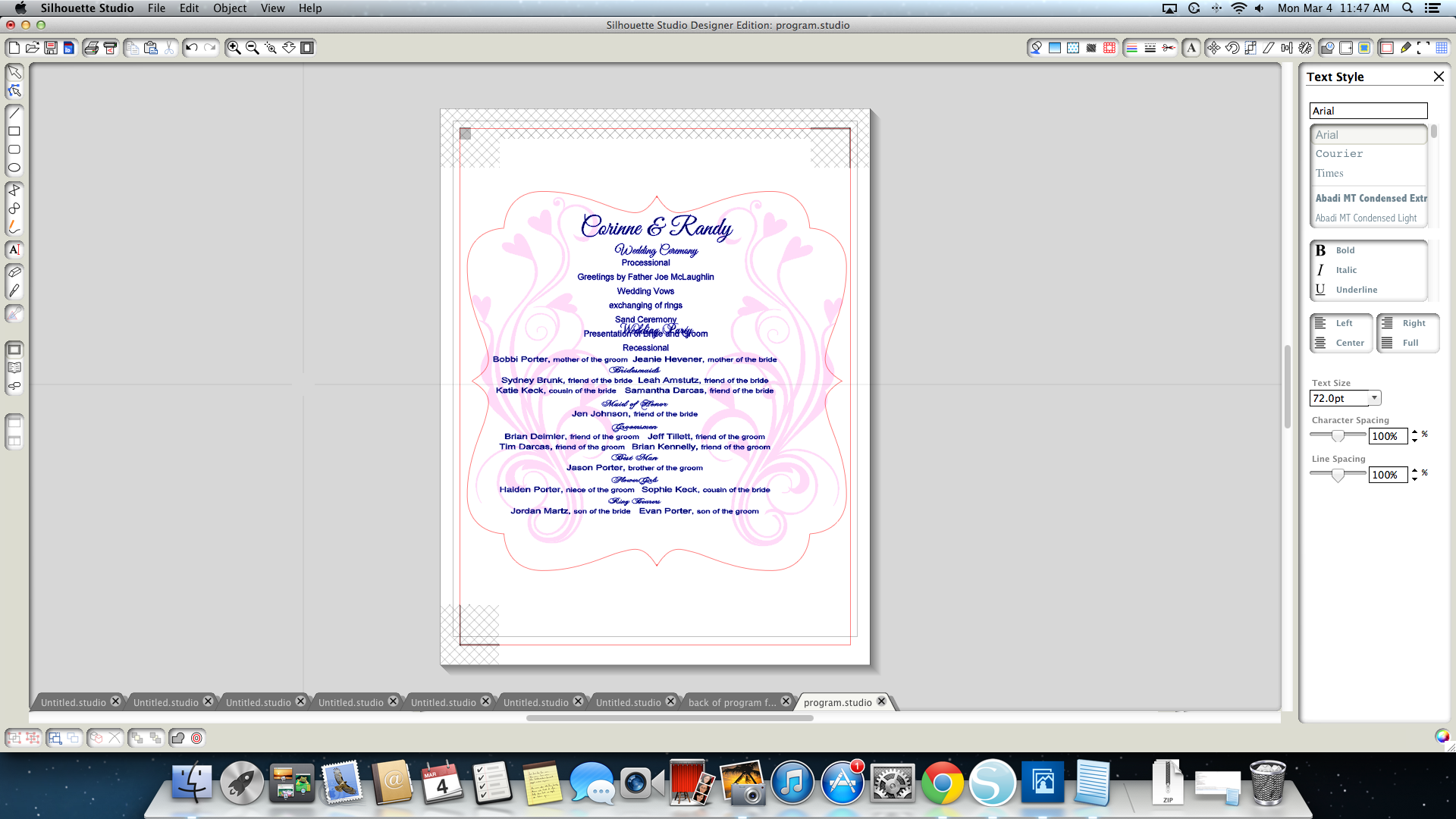 I used the Silhouette Studio software to create these programs. First I chose a shape for the fans. I used a bracket background shape. I sized it to fit on a 8 x 10 sheet of card stock with the registration marks turned on and then typed the contents. I played around with the fonts, sizing and spacing to get everything to fit and look good. I also added flourish shapes to the front of the program. This photo shows the work in progress.
