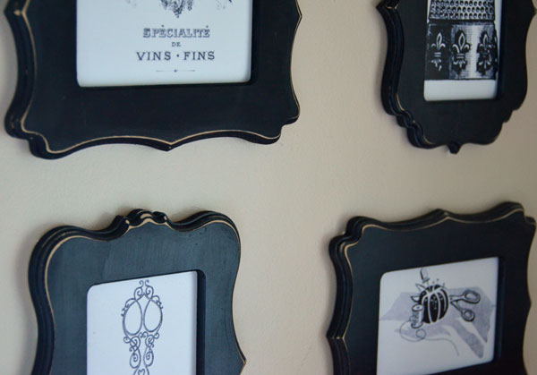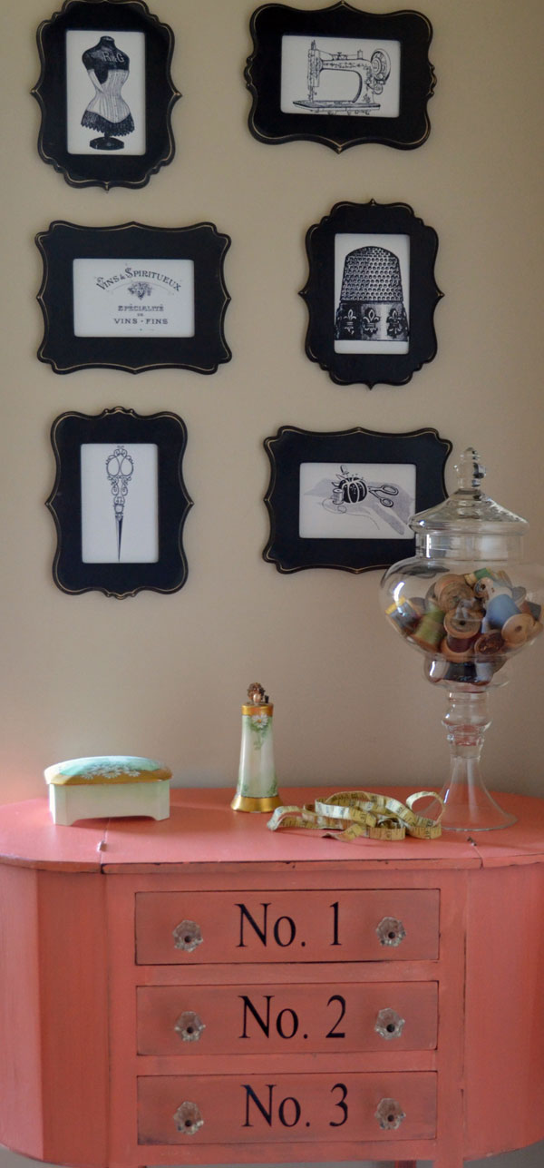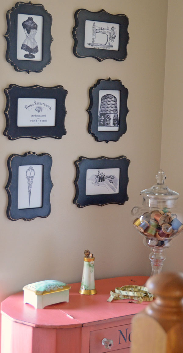Ever since I put the chalk paint project sewing cabinet in the hallway, the blank wall above it has been taunting me. It needed something. As I was reading through some of my favorite blogs, it hit me. The Graphics Fairy LLC has the most beautiful graphics on her site. I’ve always wanted to use one of her graphics some day. Well today was the day. I did a search for sewing and came away with 6 beautiful photos. I printed them out on photo paper, cut them down to fit my frames, then hung them up above the cabinet (with Command Strips of course). What do you think? I love them!