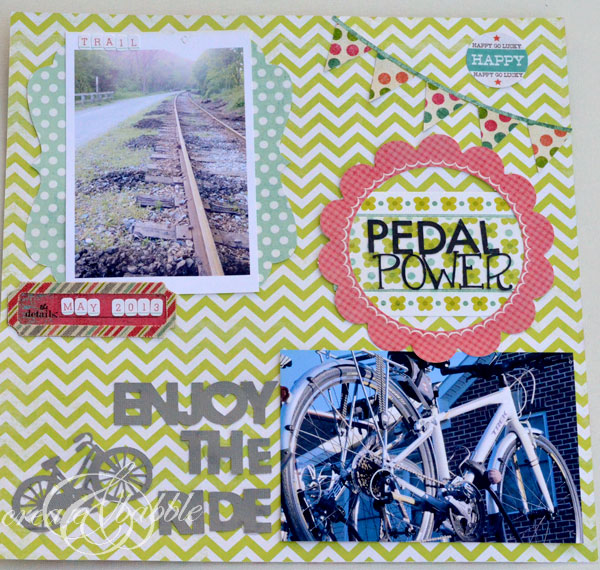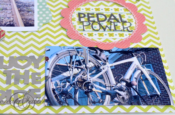 All of the supplies are from a kit that I got from peachycheap.com called Lime Twist by My Mind’s Eye. Peachy Cheap is a daily deal site that I subscribe to and I love it and highly recommend it. The letters and bicycle are Silhouette Studio files that I cut with my Cameo.
