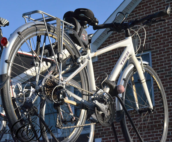 Isn’t she a beauty! Here’s the thing. See those plain ugly fenders over the wheels? I had them installed recently and here’s why: Did you ever get caught in a rainstorm while riding a dirt/gravel trail? If you haven’t, then you’ve never experienced a “racing stripe” of mud down your back. That’s if you don’t have fenders on your bike. I always thought fenders were so not cool. Until that day it rained. hard. And I got my first “racing stripe”. Not cool. And no, I don’t have a photo of it. ; )