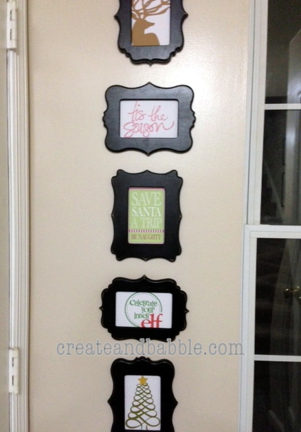 One is a narrow wall by the front door. Earlier this year, I got these 4 x 6 frames from Pick Your Plum, one of my favorite deal-of-the-day sites. First I painted them black and slightly distressed the edges with a sanding sponge. Then I switch out the contents of the frames to match the season or holiday.