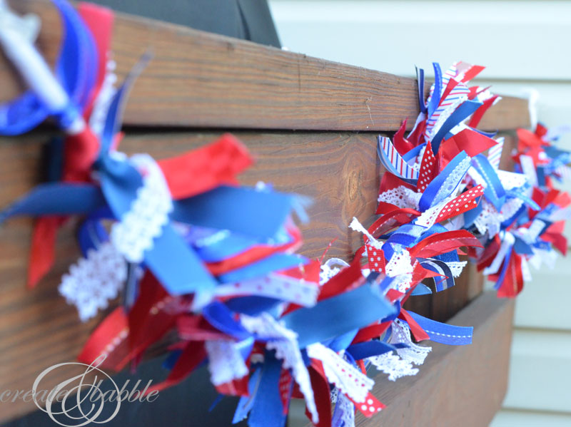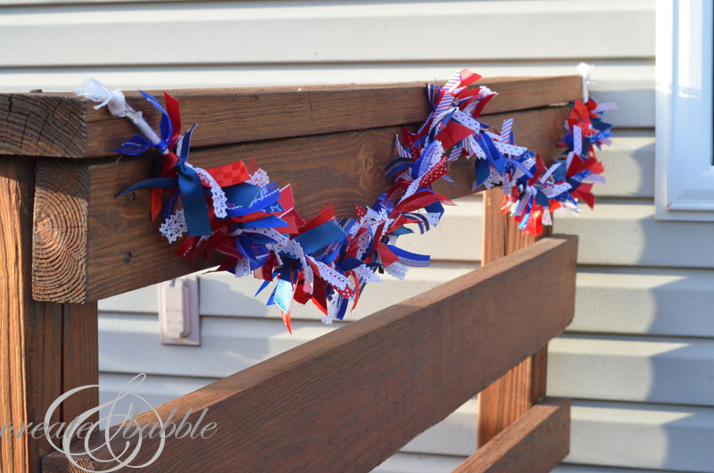 I used ALL of the red, white and bluc ribbon that I own and that determined the length of my garland ; ) I had a long piece of white rope and when I ran out of ribbon, I was done! I cut the rope and tied a knot at each end and attached the ribbon garland to my deck railing.