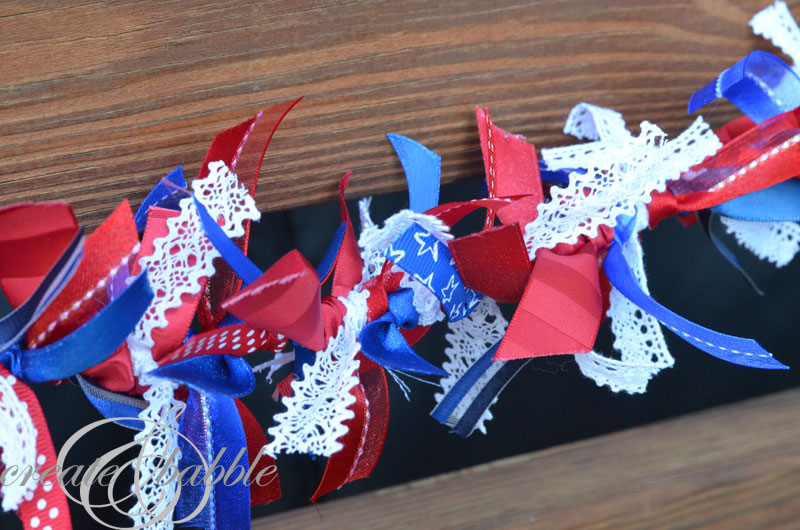 I cut the ribbon into 5 – 6″ lengths and simply tied them onto the rope with a single knot and smush them together. That’s it!