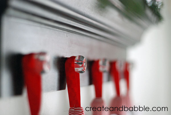I know. It’s not a “real” mantel, but what do you think? I found this shelf at Homegoods and thought it would make a perfect faux mantel on which to hang the stockings. The best part: it has glass knobs, which I love.
