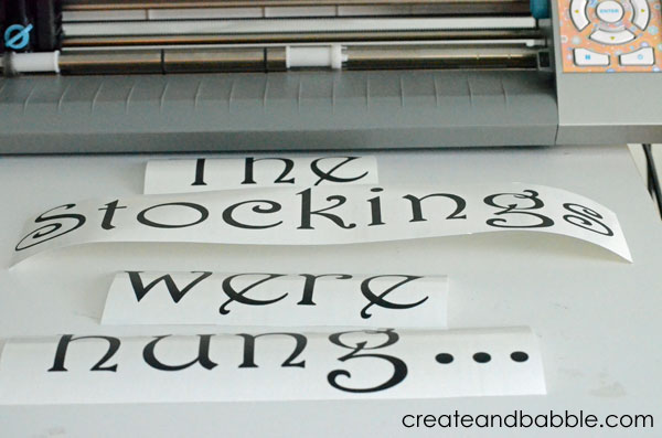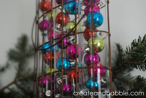 The shelf and stockings just weren’t enough. I made vinyl lettering with my Cameo, added branches that were left over from trimming the Christmas tree, a Santa that my sister made for me many years ago and some candles. The glass vases in the wire carrier came from a long-ago art show. I filled the vases with tiny ornaments I found at Target.