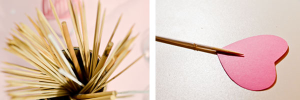 Next I grabbed some wooden skewers, painted them with leftover white paint and hot-glued the hearts onto the tips of the skewers.