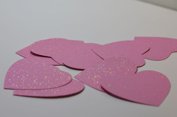 Now onto the hearts. I found this pretty, sparkly, pink cardstock at JoAnn and then cut out heart shapes using my Cameo. You could also cut these by hand or use a punch.