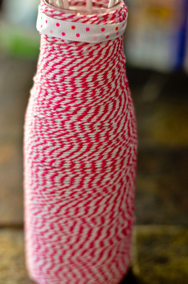 Here’s how I made it. Remember the jars of baker’s twine that I talked about here? I have a ton of it – how I got all that is a story for another day. Anyway, I used up some of the pink and white baker’s twine. I sprayed the outside of the bottle with spray adhesive, then simply wrapped and wrapped and wrapped the baker’s twine around the entire bottle. There is a lip near the top that is too narrow for the twine to adhere to, so I covered that with some coordinating ribbon.