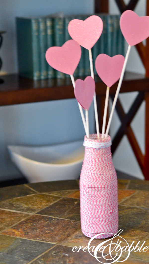 Here is an easy-to-make Valentine’s Day Centerpiece made with a Starbucks Frappuccino bottle.