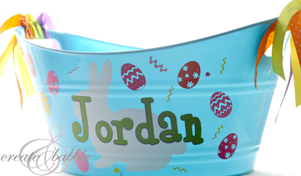 The bucket I used is one I had leftover from last Easter. It came from the Dollar Tree. Since kids love seeing their names on everything, I used my Cameo to cut his name out of vinyl. The font I used is Boyz R Gross and to get the shadowed effect, I cut it twice from two colors of vinyl, then layered.